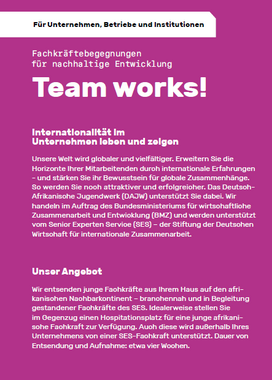 Das Infoblatt informiert Unternehmen und Betriebe und beantwortet die Kernfragen zur Programmlinie "Team works!" des Deutsch-Afrikanischen Jugendwerks (DAJW).